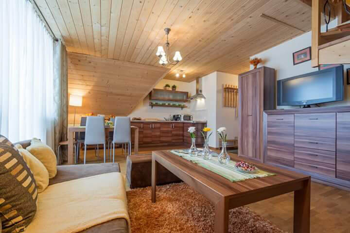 Apartamento POD-SMERKIEM - Sin duda, es un apartamento de montaña ideal en estilo rústico, a 6 km de Zakopane, perfecto para padres con hijos. Pisos y paredes de madera, inclinaciones pronunciadas (efecto de las propiedades beneficiosas y regeneradoras de la pirámide), escaleras que conectan dos pisos muy espaciosos y, finalmente, excelentes vistas de los Tatras occidentales. Cerca, hay pistas de esquí con remontes y piscinas termales en Chochołowskie Termy y piscinas en Szymoszkowa.