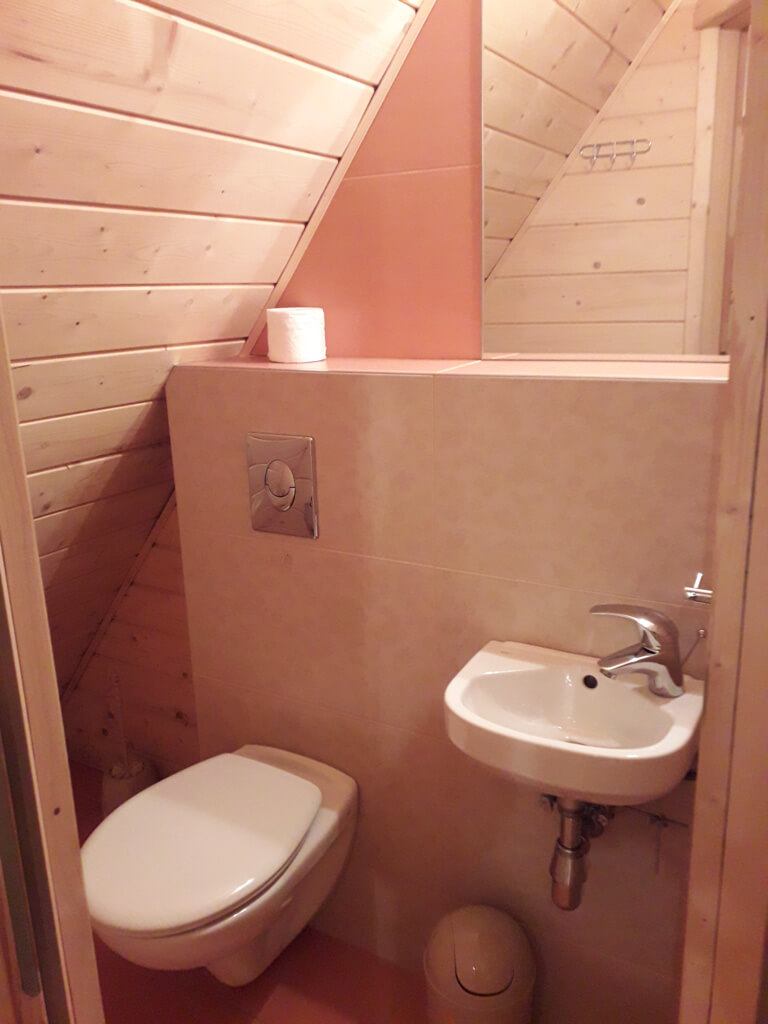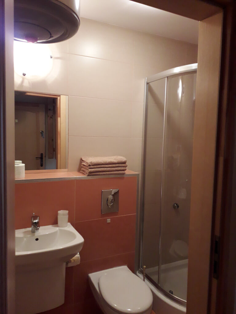 cabina de ducha, lavabo, inodoro, secador de pelo, toallas, suelo radiante